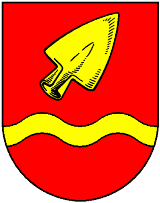 gelber Wellenbalken auf rotem Grund, darüber gelbe Pflugschar auf rotem Grund